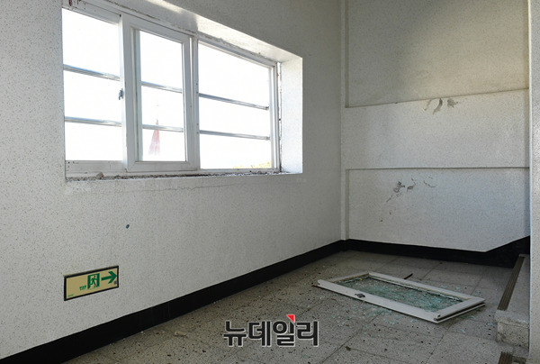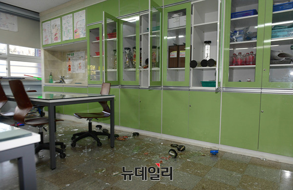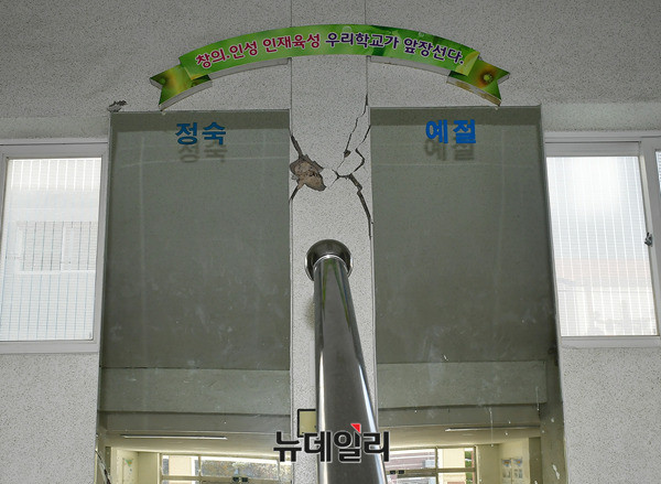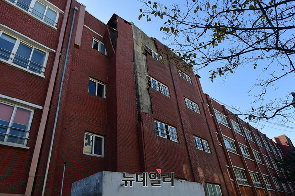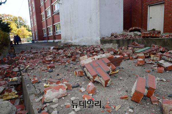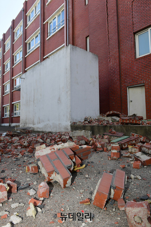 포항에서 발생한 5.4규모의 지진으로 16일 오전 포항시 북구 흥해읍 흥해중학교 건물 외관이 훼손된채 방치되고 있다.