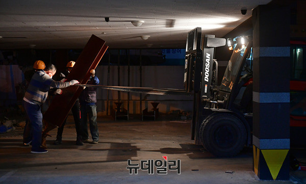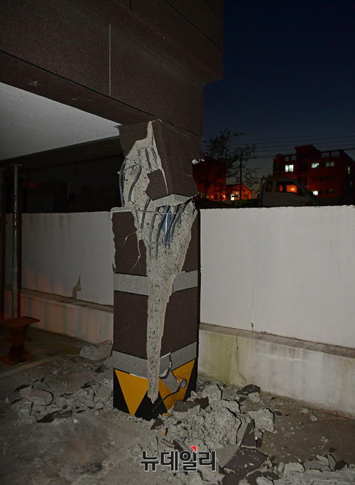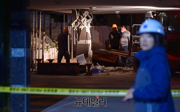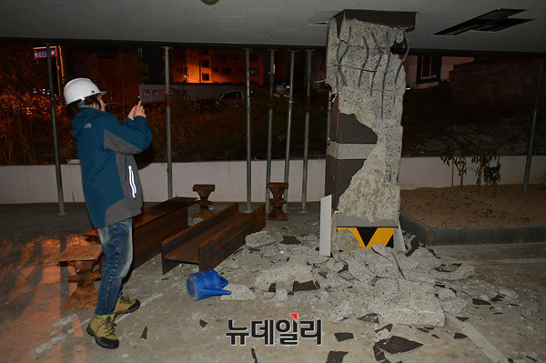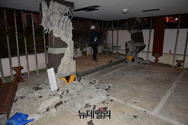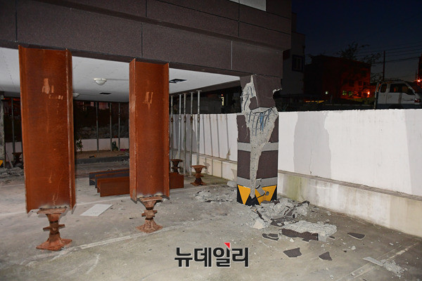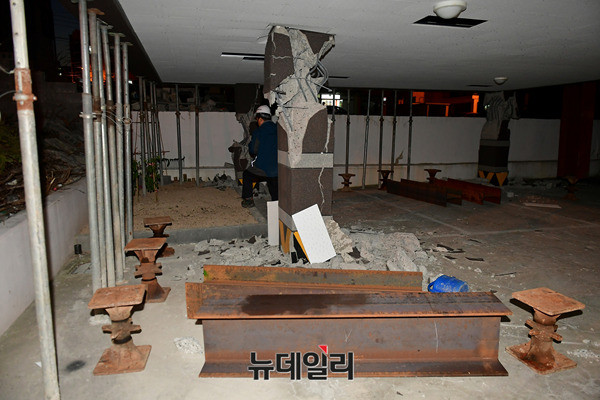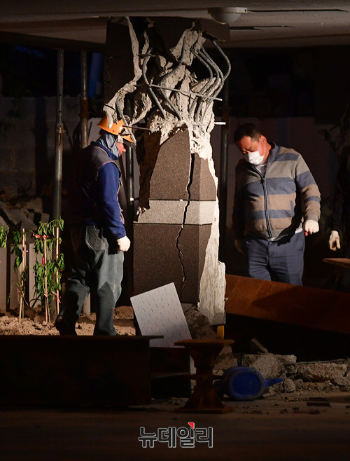 기둥에서 철골 구조물이 드러난 포항 북구의 한 건물에서 16일 오후 건물 붕괴를 막기위해 임시 기둥을 설치하는 작업을 진행하고 있다. 현재 이 건물은 긴급 위험도 평가에서 '위험' 등급을 받아 거주 및 출입이 금지돼 있다.
