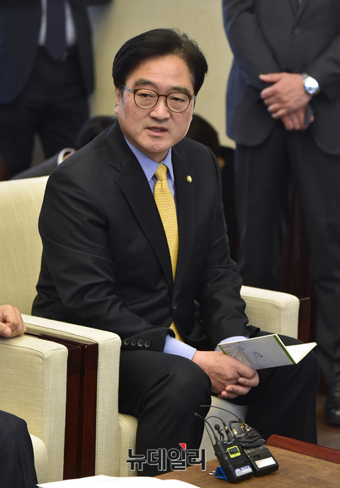 더불어민주당 우원식 원내대표가 가 20일 오전 국회 의장 접견실에서 열린 정세균 국회의장을 비롯한 여야 3당 원내대표 회동에서 모두발언을 하고 있다.