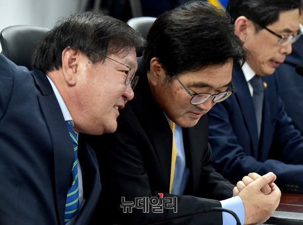 더불어민주당 우원식 원내대표와 김태년 민정수석이 20일 오후 국회 의원회관에서 열린 공직자비리수사처 설치법 제정 관련 당정청회의에서 대화를 나누고 있다.