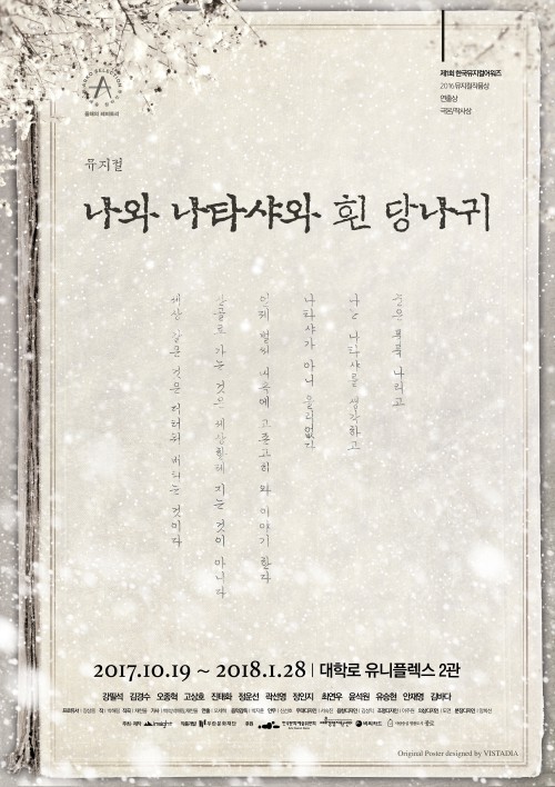 뮤지컬 '나와 나타샤와 흰 당나귀'가 예그린뮤지컬어워드에서 극본상을 수상했다.지난 20일 충무아트센터 대극장에서 진행된 '제6회 예그린뮤지컬어워드'는 창작 65편, 라이선스 22편 총 87편의 작품이 출품됐으며, 시상은 6개 부문에서 총 21개 상이 주어졌다.이날 극본상 부문에는 '나와 나타샤와 흰 당나귀'를 집필한 박해림 작가가 호명됐다. 박 작가는 "뮤지컬에서 극본 작업은 혼자 이뤄나가는 것이 아니라는 생각을 한다. 파트너인 채한울 작곡가와 기쁨을 같이 나누고 싶다"며 수상 소감을 전했다.이어 "대사, 지문 하나하나 아껴주신 배우들과 오세혁 연출을 비롯해 작품이 완성되기까지 도움을 준 인사이트엔터테인먼트와 우란문화재단 식구들에게 너무 감사 드린다. 더 잘 쓰라고 주시는 상이라고 생각하고 감사히 받겠다"고 덧붙였다.시인 '백석'과 기생 '자야'의 아름다운 사랑 이야기를 그린 '나와 나타샤와 흰 당나귀'는 우란문화재단 '시야 스튜디오'를 통해 개발된 작품이다. 지난해 초연을 거쳐 올해 재연까지 탄탄한 극본, 아름다운 피아노 선율, 배우들의 섬세한 연기가 더해져 호평을 받고 있다.한편 뮤지컬 '나와 나타샤와 흰 당나귀'는 예그린뮤지컬어워드 수상을 기념하고자 11월 21일 오전 10시부터 오후 10시까지 50% 할인 타임세일을 진행한다. 공연은 2018년 1월 28일까지 대학로 유니플렉스 2관에서 만날 수 있다. 관람료 4만~6만원. 문의 02-541-7110.