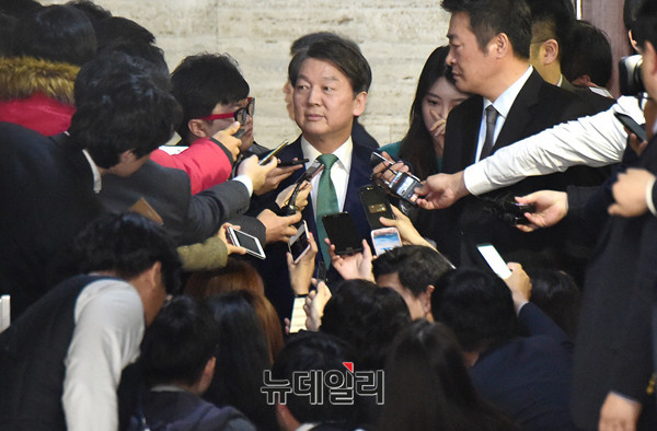 안철수 국민의당 대표가 21일 오후 국회에서 열린 바른정당과의 연대 및 통합론에 대한 의견을 교환하는 비공개 의원총회에 참석하고 있다.