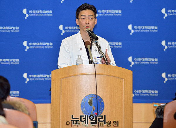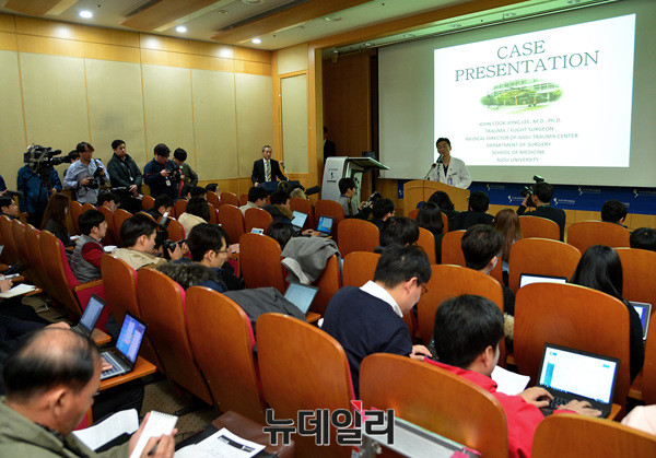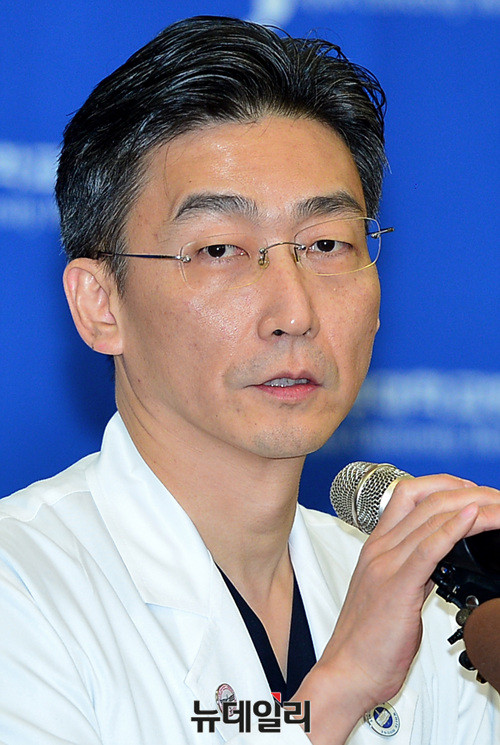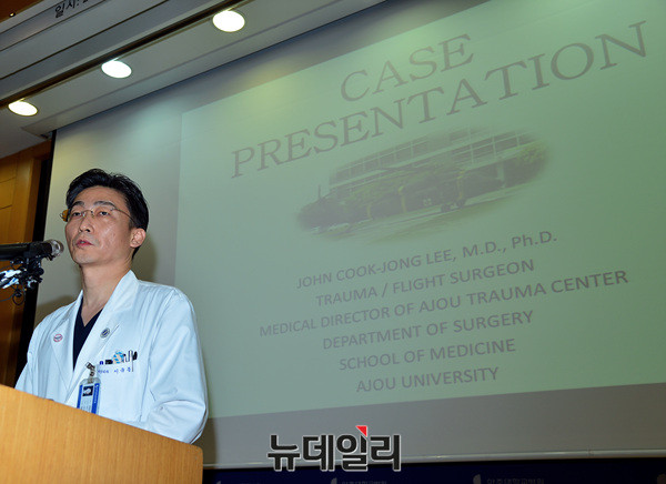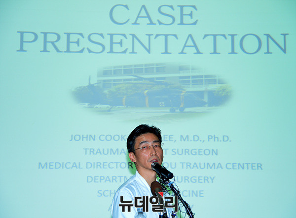 이국종 아주대학교 중증외상센터 교수가 22일 오전 경기 수원시 아주대학교병원에서 북한군 병사 상태 브리핑 대신 중증외상센터 현실을 말하고 있다.