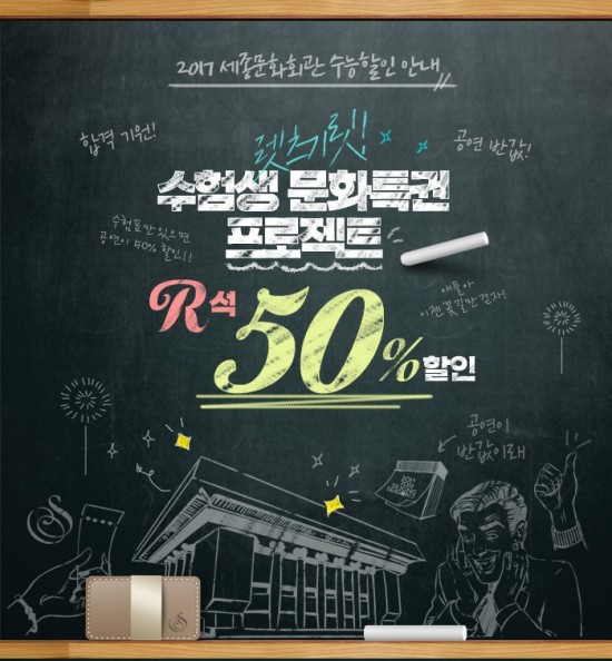 ◇ 세종문화회관, 수험표 챙기면 티켓 최대 반값세종문화회관(사장 이승엽)은 수험생을 격려하고 응원하는 의미로 공연을 특별 할인한다. 오케스트라부터 국악까지 다양한 장르가 포함돼 있다. 대부분 수험표를 지참한 수험생 본인에 한해 할인되고, 좌석등급과 공연일이 제한돼 있는 경우도 있으니 잘 살펴봐야 한다.서울시청소년국악단의 '귀향- 끝나지 않을 노래'(12.5), 서울시오케스트라의 '윈터클래식'(12.8), 서울시국악관현악단의 '한양 그리고 서울'(12.14), 서울시합창단의 '크리스마스의 노래'(12.15~16)까지 4개의 공연이 수험생 본인에 한해 R석 티켓을 반값에 제공한다.