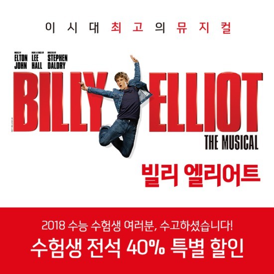 ◇ '빌리 엘리어트'부터 '광화문연가'까지 전석 40% 할인뮤지컬 '빌리 엘리어트' 수험생 할인은 11월 28일부터 12월 8일 공연에 한해 전석 40% 할인된 금액으로 예매할 수 있다. 티켓 예매는 수능 당일인 23일부터 인터파크와 신시컴퍼니 홈페이지에서 가능하며, 수험생 본인만 적용된다. 오는 28일 신도림 디큐브아트센터에서 개막한다. 관람료 6만~14만원.새로운 모습으로 관객들을 맞이할 '베어 더 뮤지컬'은 2018학년도 수험표를 지참한 수험생들에게 12월 1~8일 일주일 동안 전석 40% 할인을 제공한다. 작품은 보수적인 카톨릭계 기숙학교 학생들의 엇갈린 사랑과 우정, 정체성에 대한 고민 등을 섬세하게 그려낸다. 관람료 5만5000~7만7000원.서울시뮤지컬단과 CJ E&M이 공동제작하는 '광화문연가'는 故이영훈 작곡가의 명곡들로 채워진 주크박스 창작 뮤지컬이다. 2018년 1월 공연에 한해 수험생에게 전석 40%(1인 2매에 한정) 할인 이벤트를 펼친다. 12월 15일부터 2018년 1월 14일까지 세종문화회관 대극장에서 공연된다. 관람료 4만~14만원.