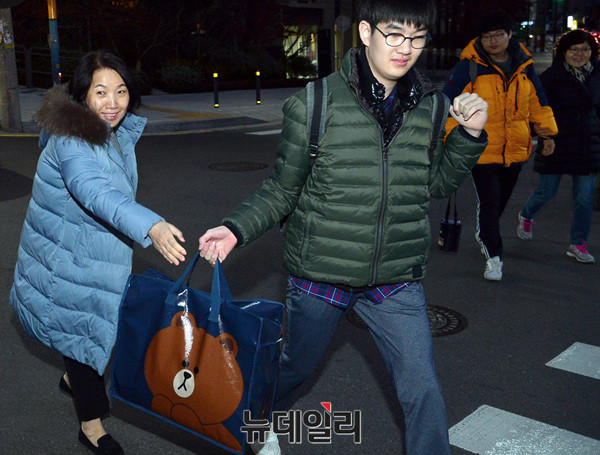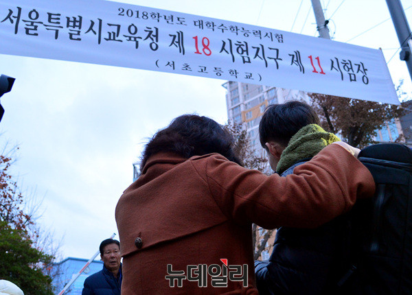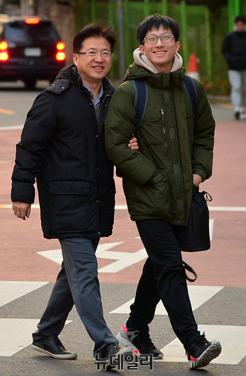 한 수험생이 23일 오전 서울 서초고등학교(제 18시험지구 11시험장)에 입실하기 전 아빠의 배웅을 받고 있다.