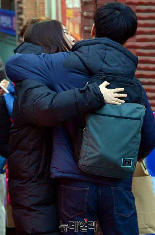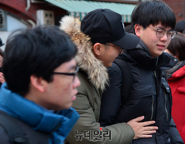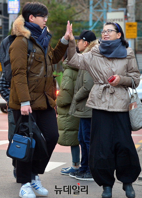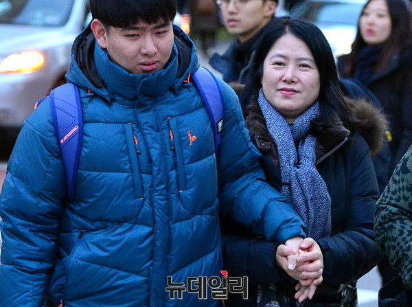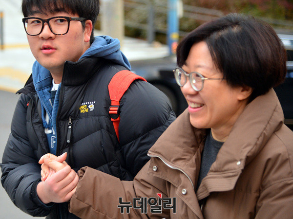 한 수험생이 23일 오전 서울 서초고등학교(제 18시험지구 11시험장)에 입실하기 전 엄마의 배웅을 받고 있다.