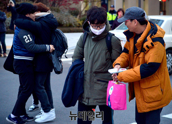 올해 수능은 지난 15일 포항에서 발생한 지진 여파로 일주일 연기됐다. 전국 85개 시험지구 1,180개 시험장에서 치러진다. 응시생은 지난해보다 1만 2천 460명 감소한 59만 3천 527명(포항 지역 6천 98명)이다. 1교시 국어영역을 시작으로 수학과 영어, 한국사·탐구, 제2외국어·한문 순으로 진행된다.