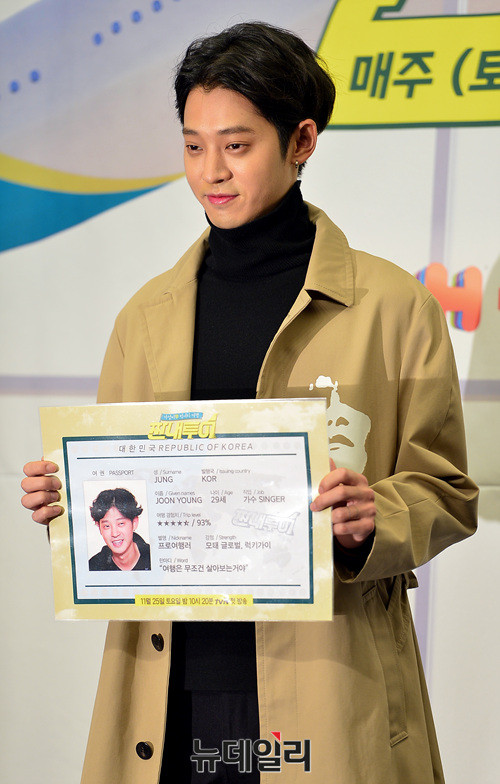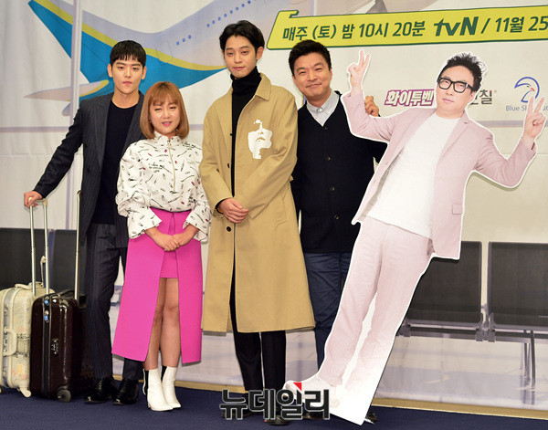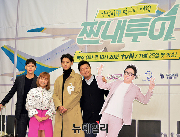 tvN 예능프로그램 '짠내투어'의 출연자들(김생민, 박나래, 정준영, 여회현)이 23일 오전 서울 마포구 스탠포드호텔에서 열린 제작발표회에 참석해 포토타임을 갖고있다.