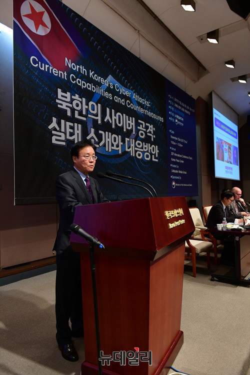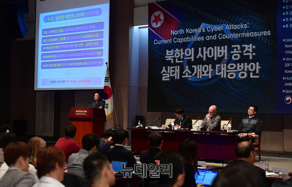 유동열 자유민주연구원장이 23일 오후 서울 중구 한국프레스센터 국제회의장에서 열린 '북한의 사이버 공격 : 실태 소개와 대응방안' 세미나에서 주제발표를 하고 있다.