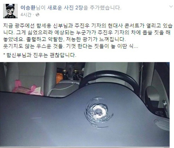 실제로 지난 2015년 말 이승환은 자신의 페이스북에 "주진우 기자가 차량 테러를 당했다"며 차량 운전석 유리창에 구멍이 나있는 사진을 게재한 바 있다.