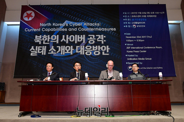 사단법인 통일미디어가 23일 오후 서울 중구 한국프레스센터에서 '북한의 사이버공격: 실태 소개와 대응방안'을 주제로 국제회의를 열고 "북한은 사이버공간과 우리 법제 허점을 최대한 활용해 사이버공격을 전개하고 있다"고 밝혔다. 회의에선 "국민들의 적극적인 관심과 정부의 전략적인 사이버안보 대책 마련이 절실하다"는 의견이 쏟아졌다.