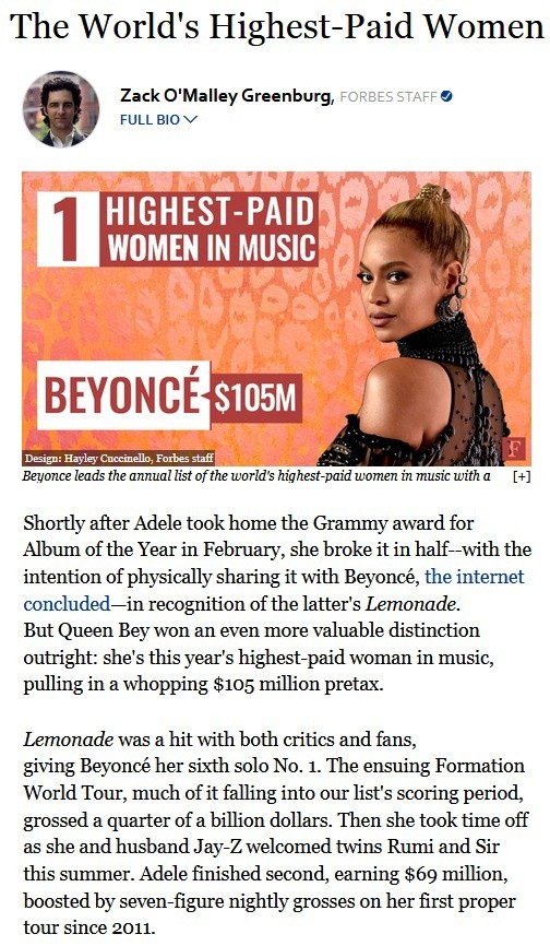 경제 전문 매체 '포브스(Forbes)'는 현지시각으로 20일 "지난해 6월부터 올해 6월까지 스타들의 세전(稅前) 소득을 살펴본 결과, 6번째 정규 앨범 '레모네이드(Lemonade)' 판매와 '포메이션(Formation)' 콘서트 투어 등을 통해 1억 500만 달러(1,140억 원)를 벌어들인 비욘세가 1위를 차지했다"고 밝혔다.