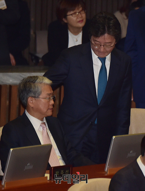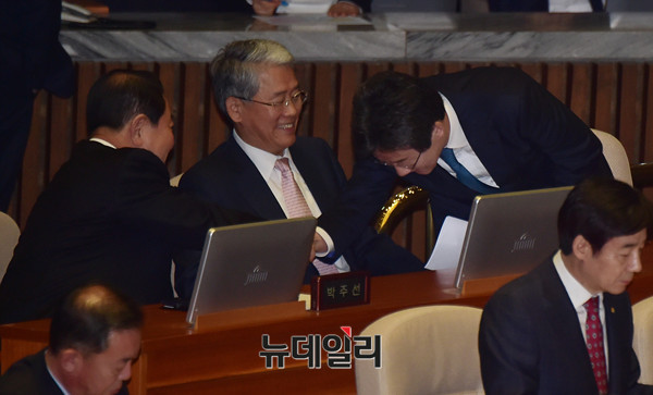 유승민 바른정당 대표가 24일 오전 국회에서 열린 본회의에 참석해 국민의당 김동철 원내대표, 박주선 의원과 대화를 나누고 있다.