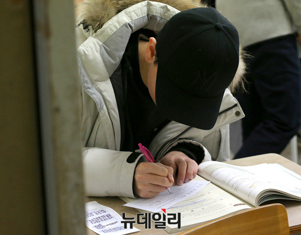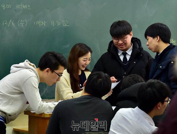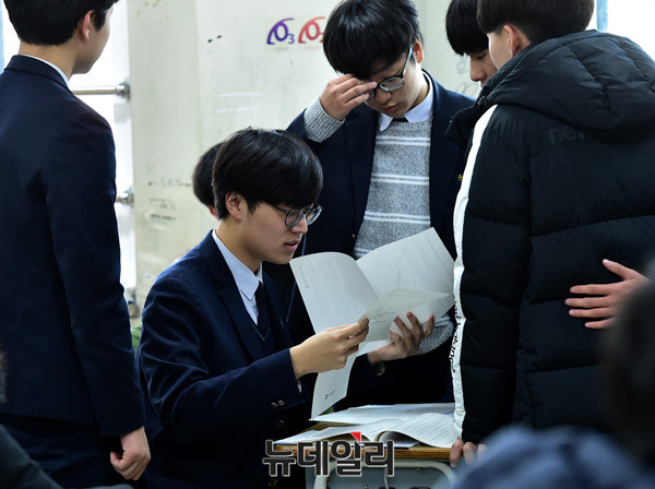 수험생들과 선생님이 24일 오전 서울 용산고등학교에서 2018학년도 수능 가채점을 하고 있다.
