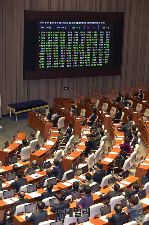 사회적 참사의 진상규명 및 안전사회 건설 등을 위한 특별법이 24일 오전 국회 본회의에서 통과되고 있다.