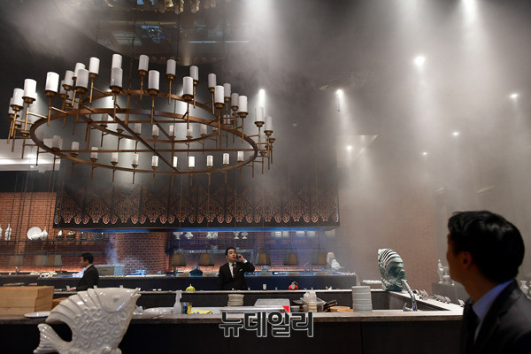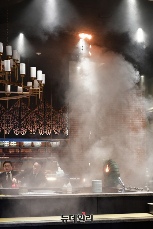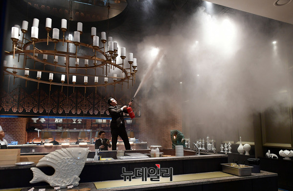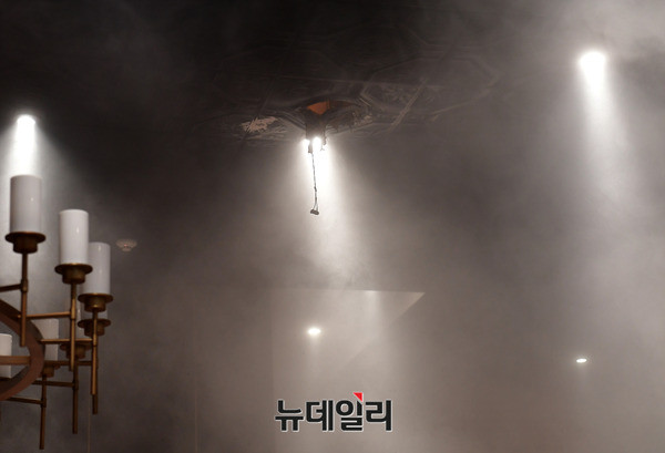 그랜드 오픈을 앞둔 강남의 한 웨딩홀 행사장 천장에서 24일 오후 합선으로 추정되는 화재가 발생해 직원이 소화기로 진화하고 있다. 이날 저녁 오픈을 축하하기 위한 웨딩파티가 취소될 위기에 있었지만 직원들의 빠른 대처로 화재는 초기에 진압해 행사는 예정대로 진행됐다.