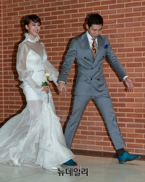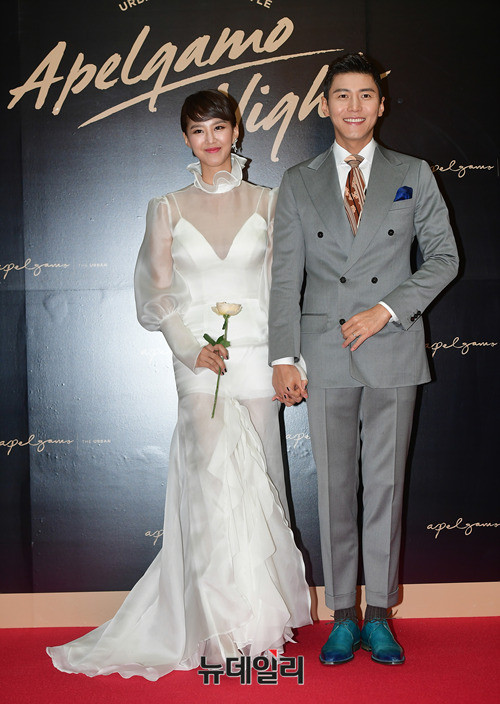 송재희, 지소연 부부가 24일 오후 서울 강남구 아펠가모 선릉점에서 열린 웨딩 파티에 입장하고 있다. 송재희, 지소연 부부는 아펠가모에서 예비부부를 대상으로 진행한 설문조사에서 가장 만나고 싶은 신혼 부부 1위로 뽑혀 이날 행사에 게스트로 초대됐다.