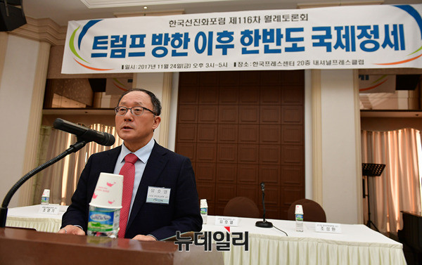 유호열 고려대 통일외교학부 교수가 24일 오후 서울 중구 한국프레스센터에서 열린 한국선진화포럼 월례토론회에 좌장으로 참석해 인사말을 하고 있다.