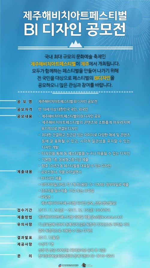 한국문화예술회관연합회(이하 한문연)가 '제주해비치아트페스티벌 BI(Brand Identity) 디자인 공모전'을 개최한다.문화체육관광부, 현대자동차그룹의 후원으로 진행되는 디자인 공모전은 12월 15일까지 진행되며, 만 18세 이상 대한민국 국민과 외국인이면 누구나 참여할 수 있다.이번 공모전은 국내 최대 규모의 공연예술 축제인 '제주해비치아트페스티벌'에 대한 관심과 참여를 제고하고, 대표 디자인 개발을 통해 브랜드 가치 향상을 추구하고자 마련됐다.페스티벌의 콘텐츠와 조화롭게 어우러지며, 친근감 있는 이미지를 바탕으로 누구나 페스티벌을 떠올릴 수 있는 디자인을 선정하게 된다. 수상자는 12월 중 발표할 예정이며, 선정자에게는 상금 500만원과 상장을 수여한다.응모방법은 제주해비치아트페스티벌 또는 한문연 홈페이지를 통해 확인할 수 있다. 공모신청서와 작품 요약설명서, 디자인 파일을 이메일(jhaf@kocaca.or.kr)로 제출하면 된다.공연 유통 활성화와 지역민의 문화향유권 신장, 국내외 관광 활성화 촉진을 위해 열리는 '제11회 제주해비치아트페스티벌'은 2018년 6월 18일부터 21일까지 4일간 제주전역에서 펼쳐진다.[사진=한국문화예술회관연합회]