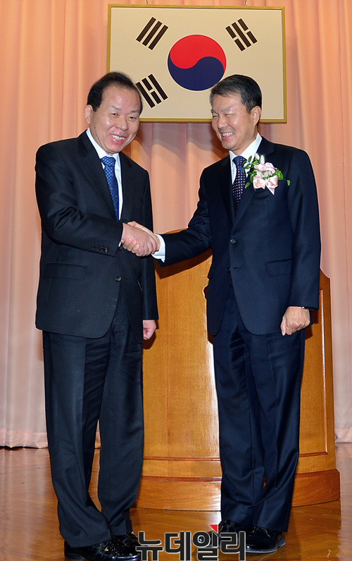 이진성 신임 헌법재판소장과 권한대행을 맡았던 김이수 재판관이 27일 오전 헌법재판소에서 열린 취임식에서 악수를 나누고 있다.