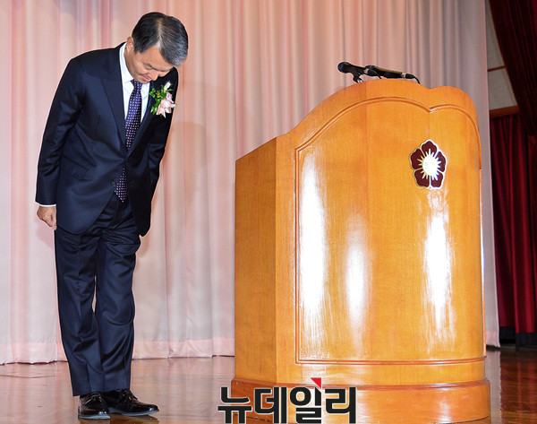 이진성 신임 헌법재판소장과이 27일 오전 헌법재판소에서 열린 취임식에서 고개 숙여 인사하고 있다.