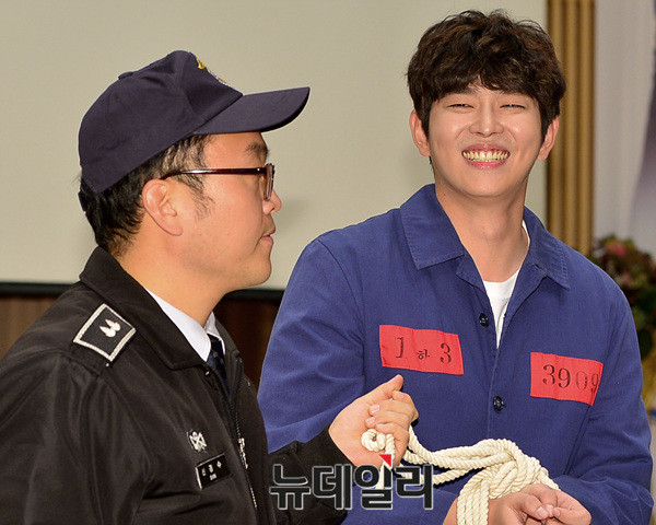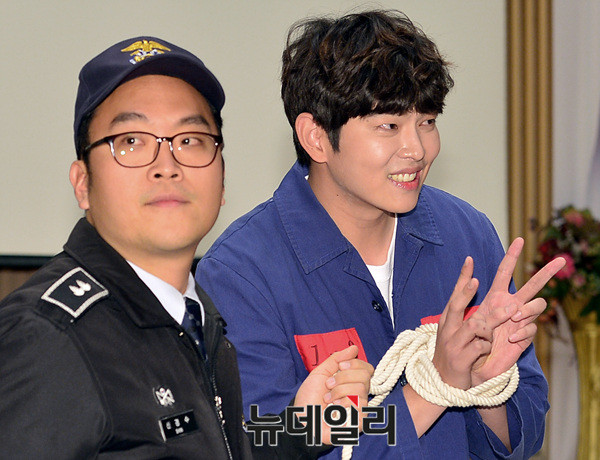 배우 윤균상이 27일 오후 서울 목동 SBS에서 열린 드라마 '의문의일승' 제작발표회에 죄수복을 입고 포승줄을 착용한 체 포즈를 취하고 있다.윤균상은 누명 쓴 사형수에서 가짜 형사가 되는 주인공 오일승 역을 맡았다.