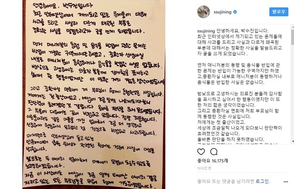 배우 박수진이 첫째 아들 출산 시 병원 특혜 루머에 대해 입을 열었다.박수진은 지난 27일 SNS에 자필 사과문을 통해 "최근 인터넷에서 제기되고 있는 문제들에 대해 사과드리고 왜곡된 부분은 사실을 말씀드리고자 글을 남긴다"고 말했다.그는 "음식물 반입한 것과 관련해서는 사실이 아니다"고 선을 그었다.하지만 면회 횟수가 정해진 중환자실을 수차례 드나든 점에 대해서는 "저희 부모님이 동행한 것은 사실이다"라면서 "저에겐 첫 출산이었고, 세상에 조금 일찍 나오다 보니 판단력이 흐려졌던 것 같다. 깊이 반성하고 있다"고 설명했다.끝으로 그는 "인터넷에서 돌고 있는 인큐베이터 입원 순서와 관련한 루머 역시 전혀 사실이 아니다"라면서 "앞으로는 두 아이의 엄마로서 모범이 될 수 있도록 노력하겠다"고 전했다.최근 한 누리꾼은 임신육아관련 커뮤니티에 "내 아기가 인큐베이터에 있다가 세상을 떠났다"고 말하면서 "배용준 박수진 부부에게 병원이 특혜를 줬기 때문"이라고 주장한 것으로 알려졌다.해당 누리꾼은 박수진 매니저가 중환자실 간호사들에게 도넛을 선물하고 부부 외에는 출입이 금지된 병실에 조부모까지 드나들었다는 의혹도 제기한 것으로 전해졌다.