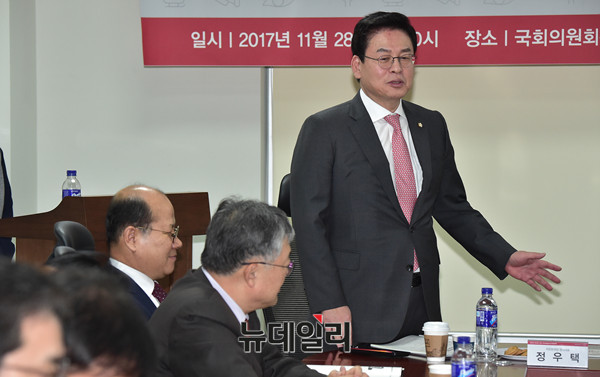 자유한국당 정우택 원내대표가 28일 오전 국회 의원회관에서 열린 '공공성 확보를 위한 지상파방송의 편성정책 토론회'에서 축사를 하고 있다.