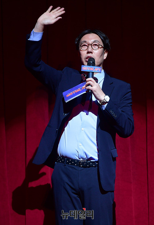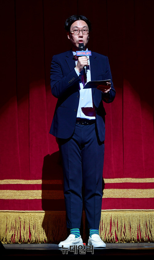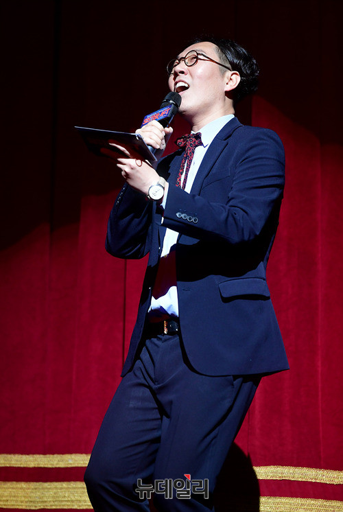 개그맨 김영철이 28일 오후 서울 용산구 블루스퀘어 인터파크홀에서 열린 뮤지컬 '시스터 액트' 프레스콜에서 사회를 보고 있다. 내한 공연으로 꾸며지는 뮤지컬 '시스터 액트'는 28일부터 마지막 티켓오픈을 진행한다. 공연은 내년 1월 21일까지 블루스퀘어 인터파크홀에서 열린다.