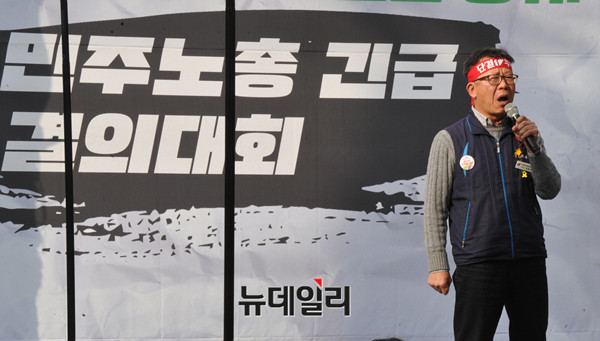 민주노총 최종진 위원장 직무대행이 28일 오후 서울 여의도 국회 앞에서 열린 '근로기준법 개악 저지, 날치기 시도 규탄, 노조 할 권리 입법 쟁취 민주노총 긴급 결의대회'에서 발언을 하고 있다.