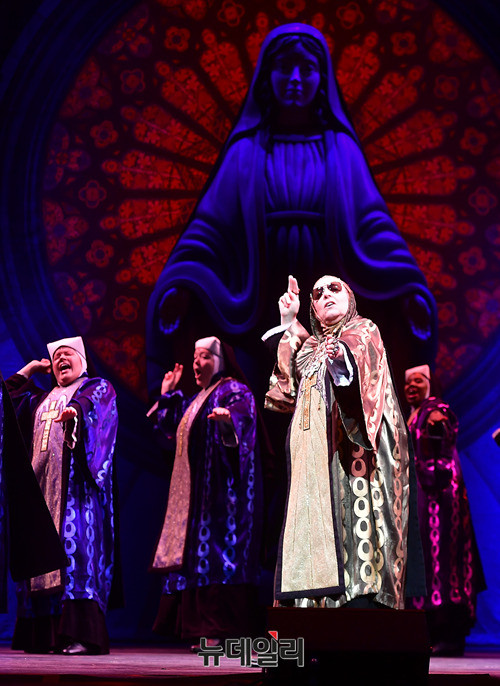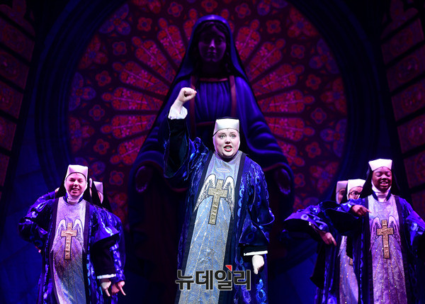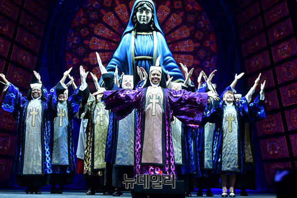 뮤지컬 '시스터 액트' 출연 배우들이 28일 오후 서울 용산구 블루스퀘어 인터파크홀에서 열린 프레스콜에서 하이라이트 장면을 시연하고 있다. 내한 공연으로 꾸며지는 뮤지컬 '시스터 액트'는 28일부터 마지막 티켓오픈을 진행한다. 공연은 내년 1월 21일까지 블루스퀘어 인터파크홀에서 열린다.
