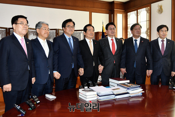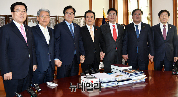 정세균 국회의장과 김동철 국민의당, 우원식 더불어민주당, 정우택 자유한국당 원내대표가 29일 오전 국회의장실에서 열린 '내년도 예산안 처리 문제 협의를 위한 여야 원내대표 회동'에서 기념촬영을 하고 있다.