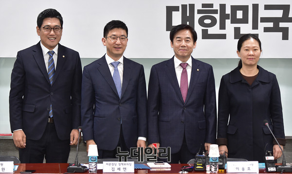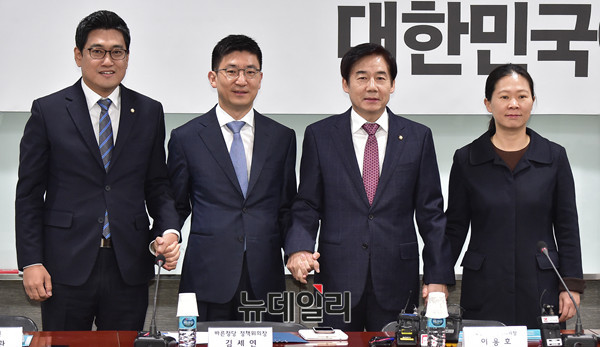 바른정당 김세연 원내대표 권한대행 겸 정책위의장,오신환 의원, 국민의당 이용호 정책위의장과 권은희 원내수석부대표가 29일 오전 국회 의원회관에서 열린 국민의당-바른정당 정책연대협의체 출범 행사에 앞서 기념촬영을 하고 있다.