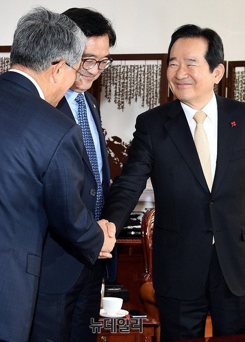정세균 국회의장과 김동철 국민의당 원내대표가 29일 오전 국회의장실에서 열린 '내년도 예산안 처리 문제 협의를 위한 여야 원내대표 회동'에서 악수를 나누고 있다.
