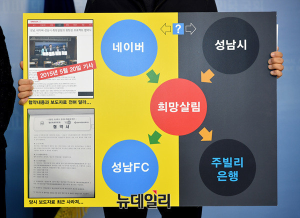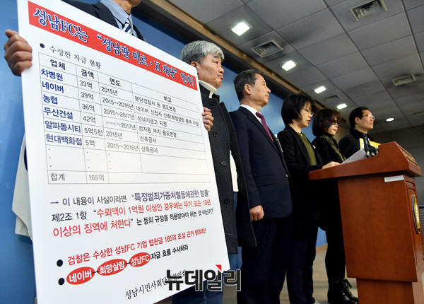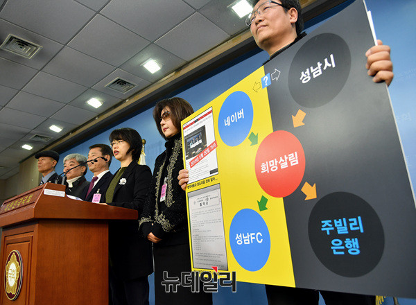 성남시민단체협의회가 29일 오전 국회 정론관에서 기자회견을 열고 성남FC 후원금과 관련해 이재명 성남시장에 대한 검찰 수사를 촉구하고 있다.