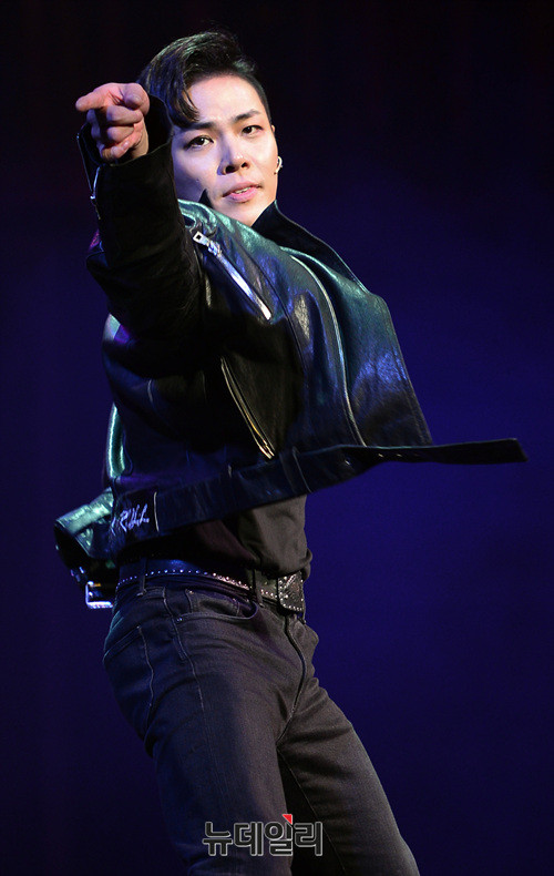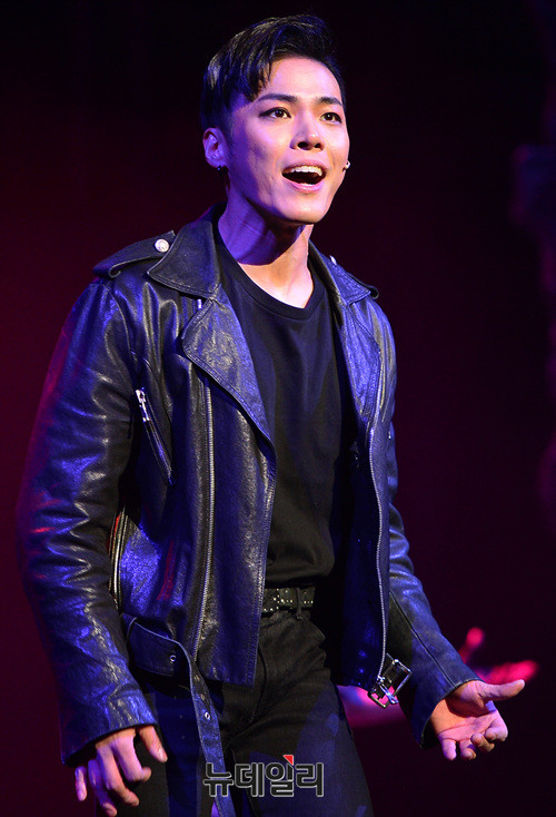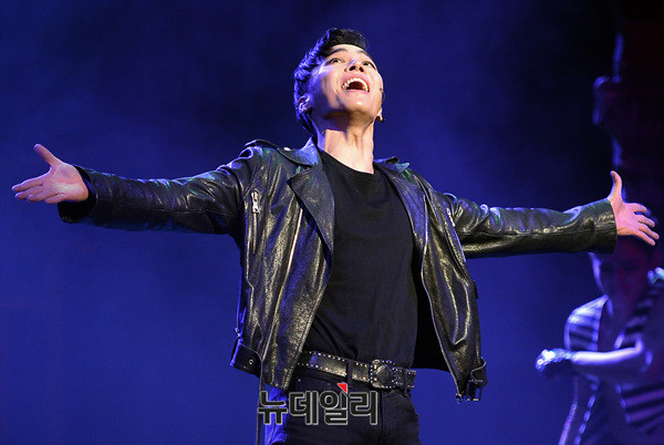 가수 휘성이 30일 오후 서울 종로구 홍익대학교 대학로 아트센터에서 열린 뮤지컬 '올슉업(All Shook Up)' 프레스콜에서 하이라이트 장면을 시연하고 있다. 휘성은 미래의 슈퍼스타를 꿈꾸는 청년 엘비스 역을 맡았다.