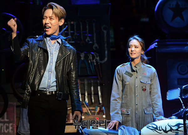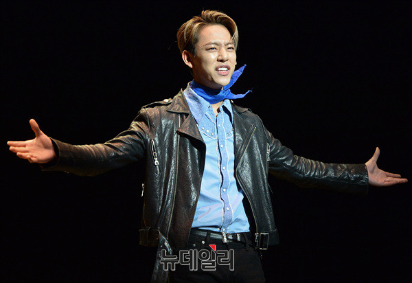 그룹 비에이피(B.A.P) 정대현이 30일 오후 서울 종로구 홍익대학교 대학로 아트센터에서 열린 뮤지컬 '올슉업(All Shook Up)' 프레스콜에서 하이라이트 장면을 시연하고 있다. 허영생은 미래의 슈퍼스타를 꿈꾸는 청년 엘비스 역을 맡았다.
