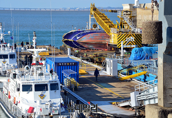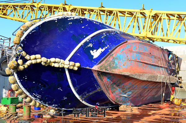 급유선과 충돌해 전복된 선창1호가 4일 오전 인천 중구 인천해양경찰서 전용부두에 예인돼있다.