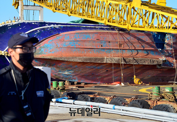 해경은 인천항으로 예인한 배에 대해 수색·분석 작업을 진행하고 있다. (인천=뉴데일리 공준표 기자)