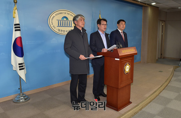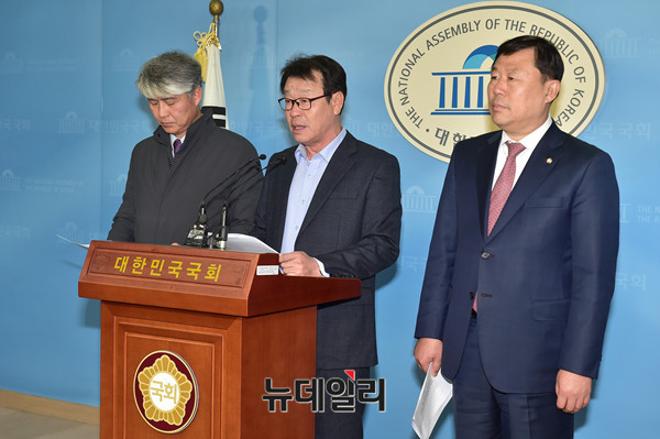 김종훈 민중당 의원, 통합진보당 강병기 비상대책위원장, 안동섭 사무통장이 4일 오전 국회 정론관에서 국가를 상대로 옛 통합진보당 당원 523명 손해배상소송 청구 기자회견을 하고 있다.