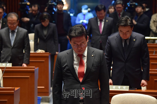 자유한국당 정우택 원내대표 등 소속의원들이 5일 오전 국회에서 열린 의원총회에서 영흥도 낚시어선 침몰 사고 피해자들에 대한 묵념을 하고 있다.