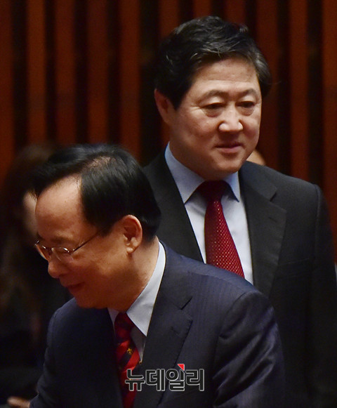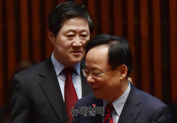 자유한국당 원내대표 경선 출마를 공식 선언한 이주영, 유기준 의원이 5일 오전 국회에서 열린 의원총회에서 스쳐지나고 있다.