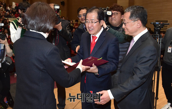 자유한국당 홍준표 대표가 5일 오후 국회 의원회관에서 열린 중앙직능위원회 발대식에서 임명장을 수여하고 있다.