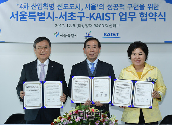 신성철 카이스트 총장, 박원순 서울시장, 조은희 서초구청장(왼쪽부터)이 5일 오후 서울 서초구 한국교원총연합회회관에서 열린 업무협약식에서 기념촬영을 하고 있다. 이날 개관한 '양재 R&CD 허브센터'는 4차 산업혁명의 기반이자 핵심기술인 인공지능(AI) 분야에 특화된 첫 번째 앵커시설로 서울 서초구 한국교원총연합회회관 4개 층(1‧5‧6‧8층, 연면적 2,900㎡)에 조성됐다.