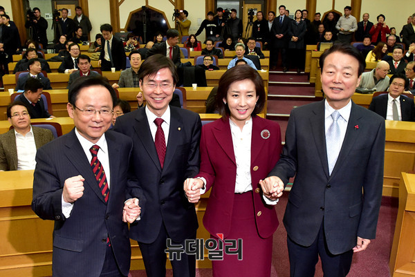 자유한국당 원내대표 경선 출마를 선언한 이주영, 조경태, 한선교 의원이 6일 오전 국회 의원회관에서 열린 중립후보 단일화를 위한 토론회에 앞서 기념사진을 촬영하고 있다.