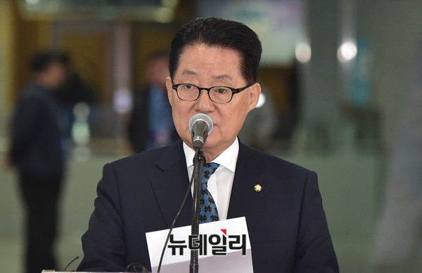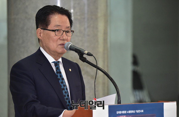 박지원 국민의당 의원이 6일 오전 서울 여의도 국회 의원회관에서 열린 김대중 전 대통령 노벨평화상 기념전시회 '거인의 어깨 위에서 더 넓은 세상 을 만나다' 개막식에 참석해 축사를 하고 있다.