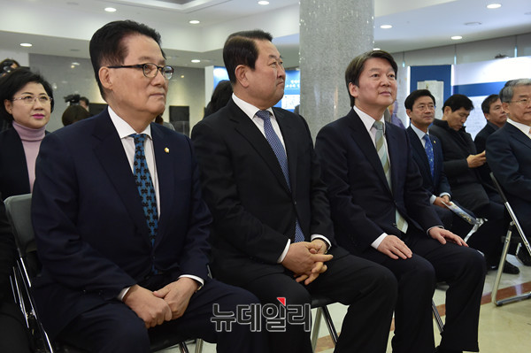안철수 국민의당 대표, 박주선 국회부의장, 박지원 의원이 6일 오전 국회 의원회관에서 열린 김대중 전 대통령 노벨평화상 기념전시회 '거인의 어깨 위에서 더 넓은 세상 을 만나다' 개막식에 참석해 앉아 있다.