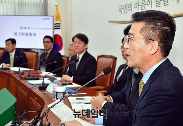 공직선거법위반 혐의로 의원직을 상실한 최명길 국민의당 의원이 6일 오전 국회에서 당대표실에서 열린 최고위원회의에 참석해 발언을 하고 있다.