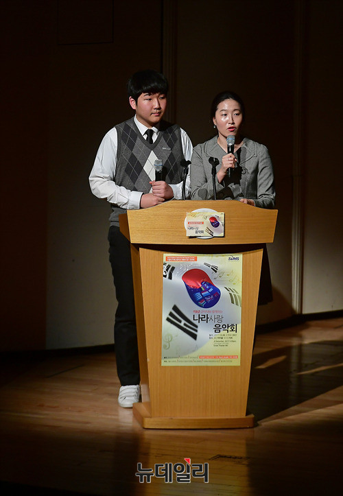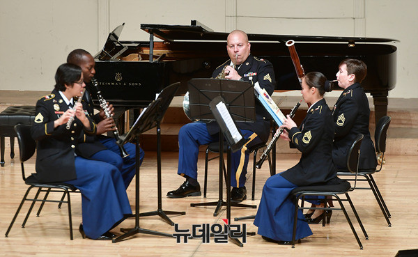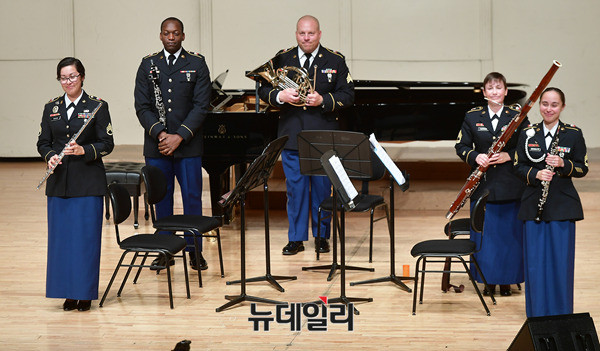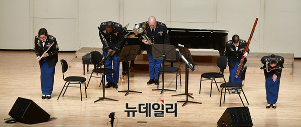 美8군 소속 군악대가 6일 오후 서울 용산아트홀 대극장 미르에서 열린 서울디지텍고등학교 나라사랑 음악회에서 연주를 하고 있다. 이번 음악회는 자유 대한민국을 지키기 위해 한국전쟁 당시 목숨을 걸고 참전한 16개 참전국에 대한 감사의 뜻을 모아 '나라사랑'을 주제로 개최됐다.